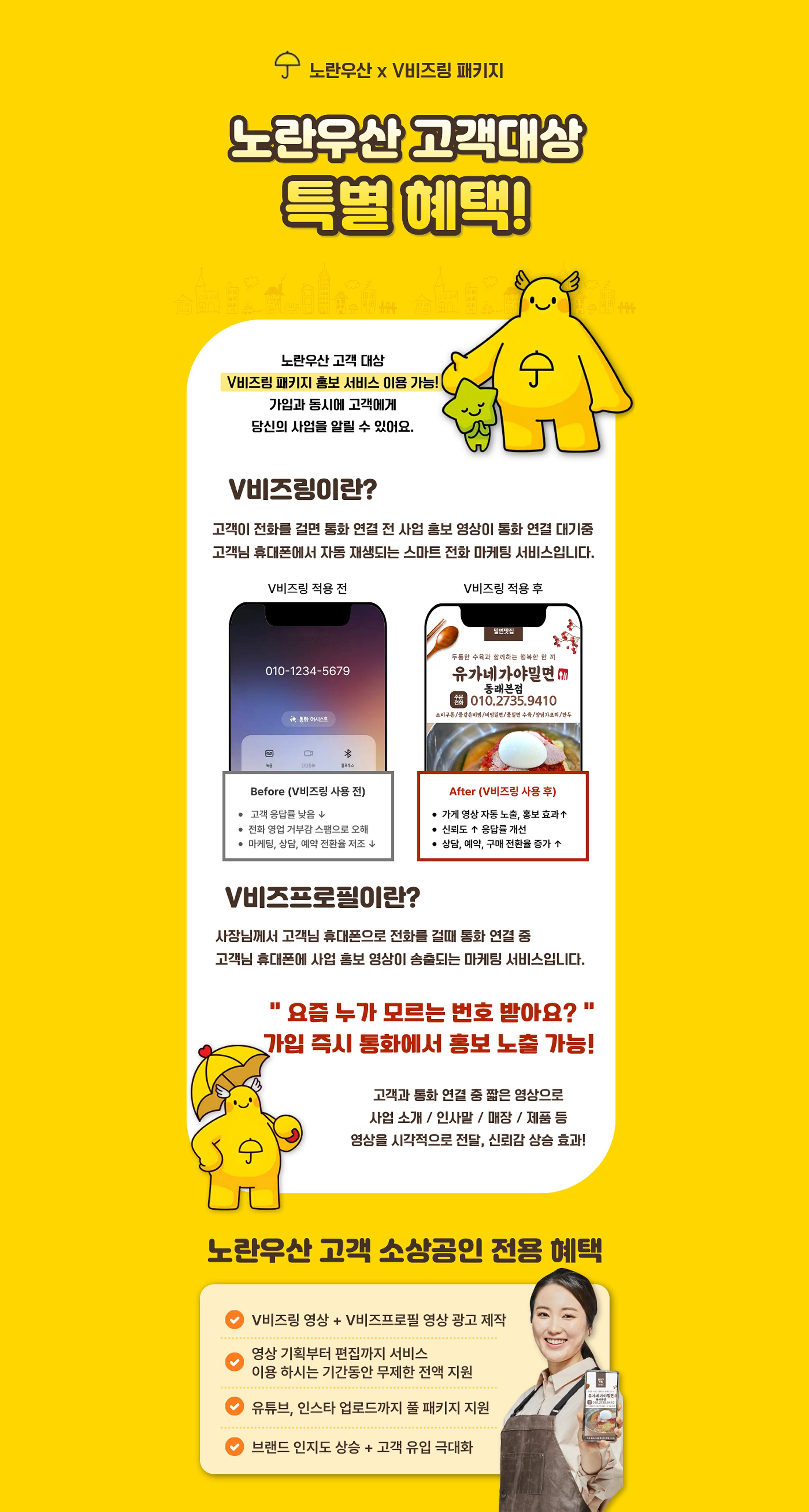 V비즈링/V비즈프로필 서비스 가입시 노란우산 회원님 업체 영업과 홍보에 도움이 되는 전용 영상을 무료 제작해 드립니다!